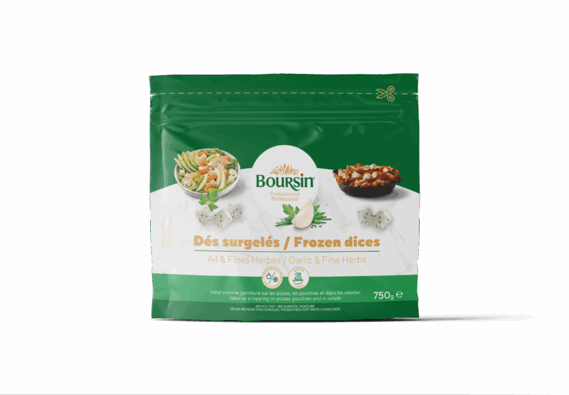 Les dés surgelés Boursin® Professionnel Ail et Fines Herbes sont très pratiques. Grâce à leur goût unique ils ajoutent facilement de la saveur à une bouchée. Les dés Boursin® s’intègrent parfaitement sur les pizzas, dans les poutines, les omelettes, les tartes, ainsi qu’avec des légumes chauds ou froids. Les dés sont également idéaux pour garnir les salades et ajouter une touche supplémentaire aux soupes. Garantie de décongélation en moins d’une heure pour les préparations froides comme les salades. Ces dés congelés sont faciles à utiliser et à portionner, ce qui aide à contrôler les coûts et à minimiser le gaspillage. Ils sont vendus dans un sac contenant environ 250 dés, chacun pesant environ 3 grammes.