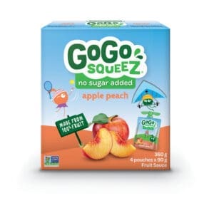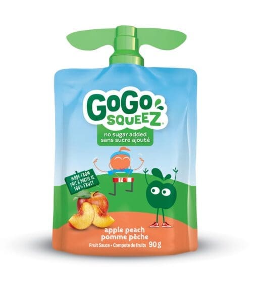 GoGo squeeZ® Pomme Pêche, est faite de fruits à 100 % et est 100 % portable et amusante à manger. Peu importe où les enfants vont, ils peuvent toujours profiter d’une collation savoureuse.