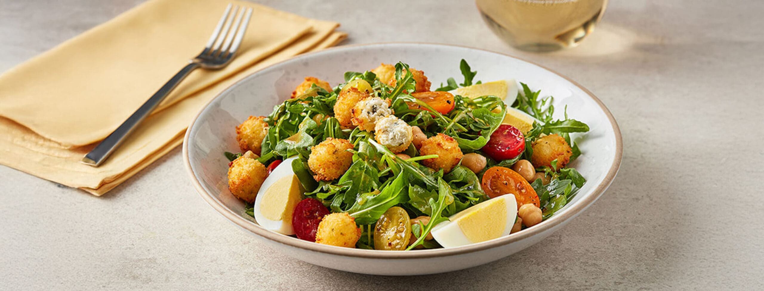 Cette recette de salade de roquette met en vedette des tomates cerises, des œufs durs, des pois chiches et une magnifique vinaigrette maison, le tout rehaussé par le croquant et la crémeuse des bouchées de Boursin® frites ! La salade parfaite pour les grands groupes, cette idée de menu est un excellent choix pour le déjeuner ou le dîner.