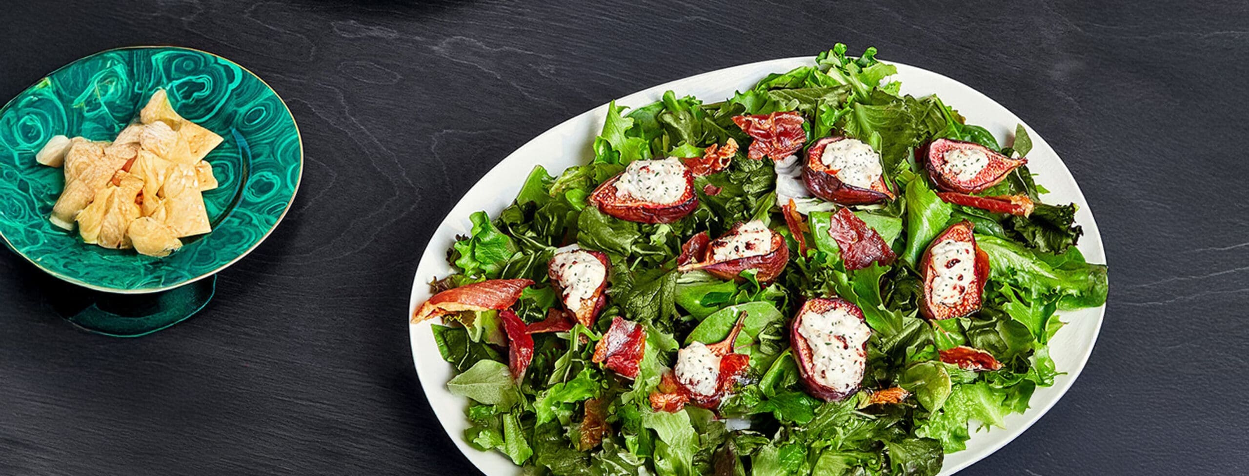 Voici un amuse-bouche rapide qui associe des figues rôties et le Boursin® Ail & Fines Herbes. Cette recette met en valeur des figues mûres délicatement passées au four, nappées d’un filet de réduction de balsamique, garnies de Boursin crémeux et de fines tranches de prosciutto, le tout sur un lit de jeunes pousses.