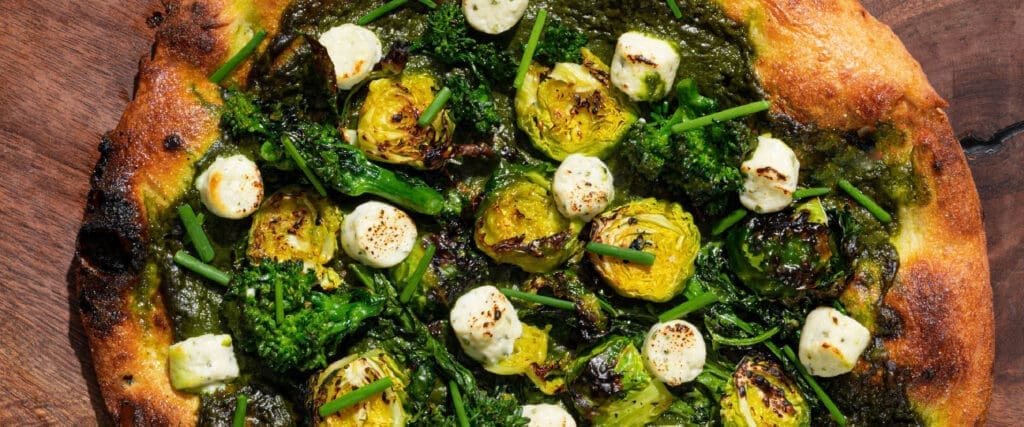 - Étendre l’émulsion aux herbes sur la base de la pâte à pizza. Répartir uniformément le rapini et les choux de Bruxelles. Ajouter les dés de Boursin® surgelés et cuire au four à 450 °F pendant 10 minutes.